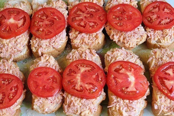 5. Выкладываем полученную массу на нарезанные кусочки батона, сверху кладем по кусочку помидора.