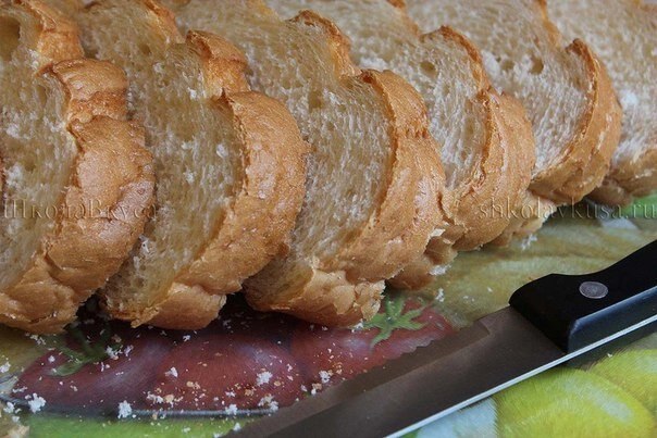 1. Батон нарезать на тонкие, примерно по 1 см, кусочки. Для нарезки мягкого хлеба используйте нож с зубчиками, чтобы кусочки получились ровными и хлеб не крошился.