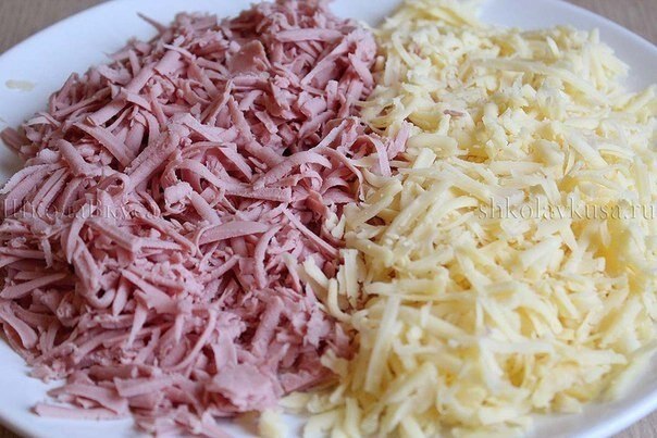2. Твердый сыр и вареную колбасу (у меня это была докторская по госту) натираем на крупной терке.