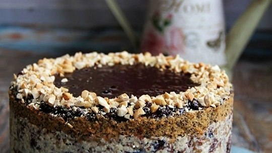 Готовность проверить зубочисткой. Готовые коржи достать из духовки и полностью остудить на решётке. Каждый корж разрезать вдоль на две части, после этого у нас получатся 2 маковых и 2 шоколадных коржа. Один маковый и один шоколадный корж отложить для торта, остальные два коржа разрезать на кубики размером 1 на 1 см. В миску всыпать кубики коржей. Грецкие орехи крупно порубить ножом и добавить к нарезанным коржам. Чернослив обдать кипятком, обсушить и нарезать на кусочки. Добавить чернослив к общей массе. Для крема соединить сгущёнку, сливочное масло комнатной температуры и сметану, взбить миксером до однородного состояния. Влить получившийся крем в миску с нарезанными коржами, орехами и черносливом. Перемешать крем с коржами, орехами, черносливом. На дно разъёмной формы выложить шоколадный бисквит, поверх него равномерно выложить всю начинку. Затем сверху выложить маковый бисквит и слегка прижать. Поставить торт на ночь в холодильник. Затем снять бортики формы и украсить верх торта по желанию. Я полила растопленным шоколадом и посыпала орешками.