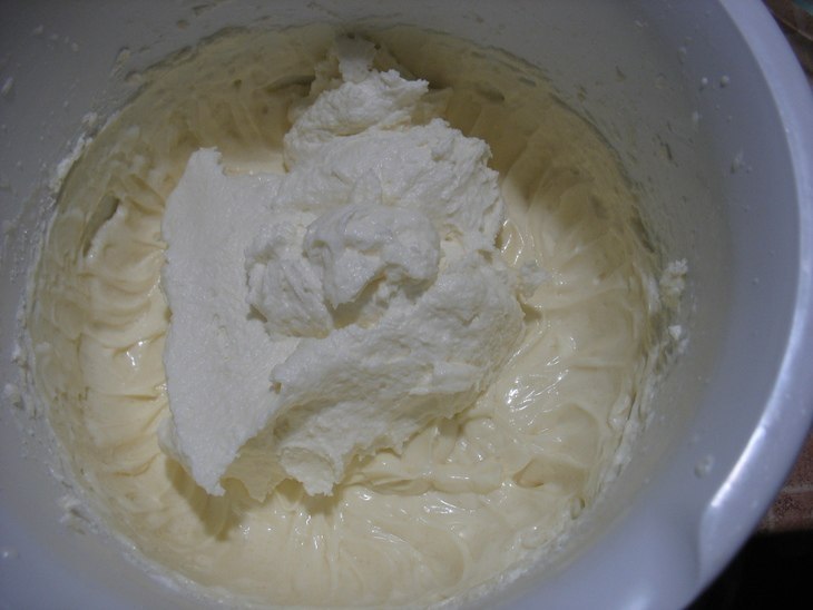 Взбить крем-сыр с сахарной пудрой, добавить взбитые до устойчивых пиков сливки.