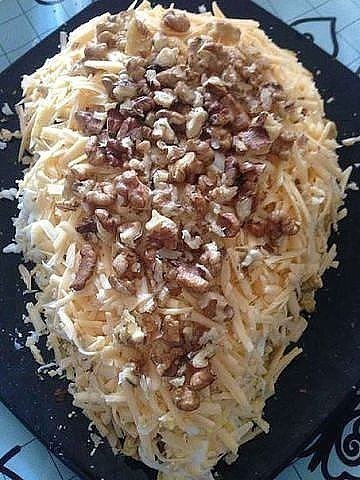 И последним слоем натираем сыр, опять же смазываем майонезом и посыпаем орехами