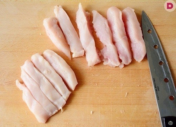 1. Куриное филе отбить обратной сторона ножа и нарезать длинными кусочками 2-3 см толщиной.