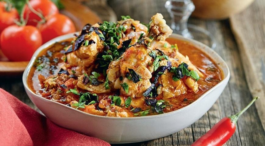 6. Положите к курице зелень, пасту из ступки, уцхо-сунели и кусочки тклапи. Еще посолите и поперчите. Тушите до мягкости курицы. Подавайте чахохбили горячим.