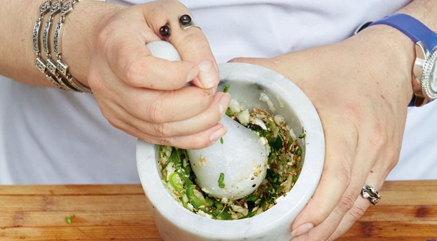 5. Очистите чеснок и крупно нарежьте. Перцы чили при желании очистите от семян, нарежьте мякоть. Сложите чили, чеснок и стебли в ступку и растолките в пасту, прибавив соли.
