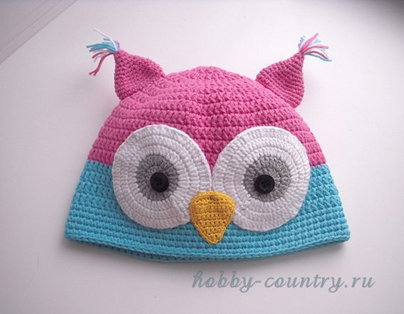 Ушки «совы» — можно использовать 2 треугольника, связанных по описанию носа «совы» и сшитых между собой (внутрь которых вставить кисточки из ниток), либо использовать другой вариант ушек (как в данном случае): набираем цепочку воздушных петель 10-15 (зависит от толщины ниток и размера крючка) и замыкаем ее в кольцо. Провязываем 2-3 ряда по кругу и начинаем постепенное убавление петель до необходимой формы ушек, вставляем кисточки из ниток.