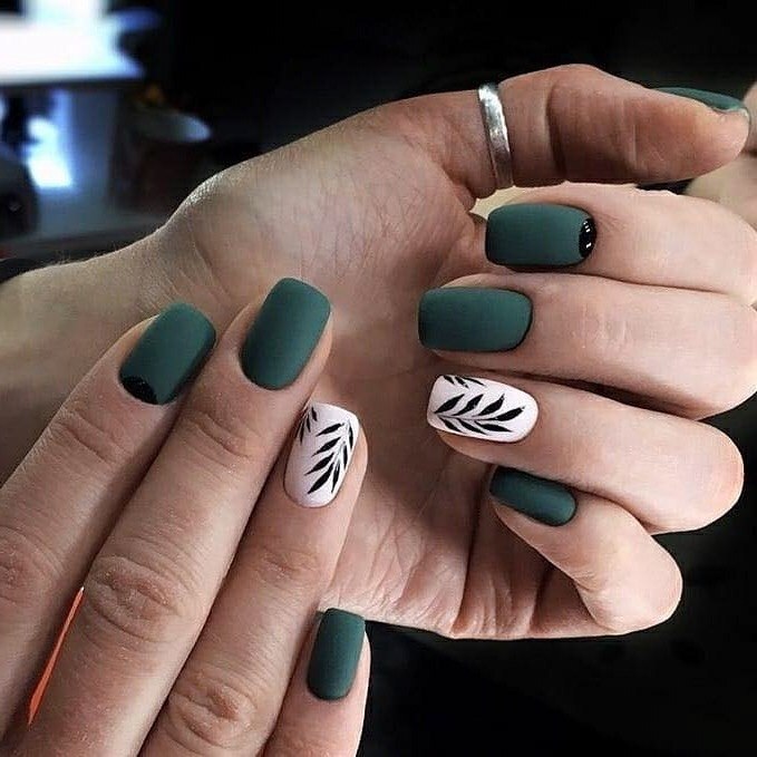 Матовый маникюр в зеленом цвете с веточками