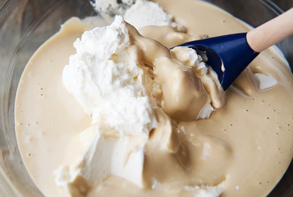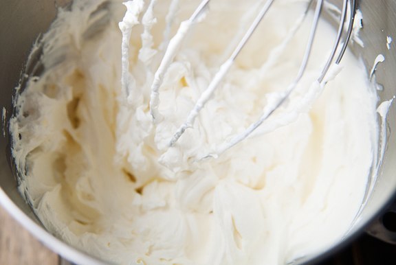 Взбить сливки до пиков. И потом аккуратно в 2 приёма добавить их в крем, перемешивая лопаточкой.