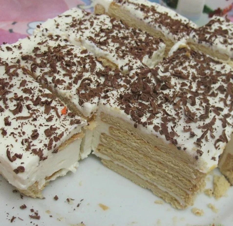 Если блин не раскатывается или прилипает к столу, то сыпать больше муки. Тесто нежное, рвётся. Намотать на скалку, перенести на противень и уложить в него тесто. Противень ничем смазывать не нужно, тесто не прилипает. Запекать (подсушить) в духовке 3 минуты до золотистого цвета. Приступить к следующему коржу (раскатать и запечь). Итого получится 8 коржей. Сложить коржи друг на друга, подравнять (обрезать) выступающие края, обрезки подсушить в духовке 3-4 минуты. Переложить коржи поочередно, обильно намазывая сверху каждый корж кремом (на каждый корж 3 ложки крема с горкой). В конце намазать кремом край (ободок) торта. Скалкой размять сухие обрезки до крупной крошки, обсыпать ей торт сверху и по бокам. По желанию растереть 20 гр. шоколада или арахиса и тоже посыпать. Поставить торт в холодильник на 2 часа пропитаться. В разрезе слой крема должен быть равен по толщине слою коржа.
