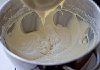 Добавляем просеянную с содой и разрыхлителем муку, взбиваем до однородности. Добавляем сметану и еще раз взбиваем.