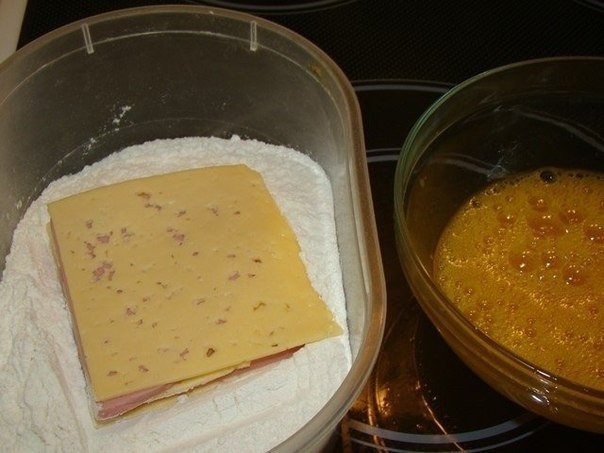 Сыр порезать тонкими ломтиками, колбасу также порезать ломтиками. На кусочек сыра кладем кусочек колбасы,затем снова сыр, колбаса,сыр. Панируем в муке,затем в яйце,снова в муке и в яйце.Жарить на горячей сковородке.
