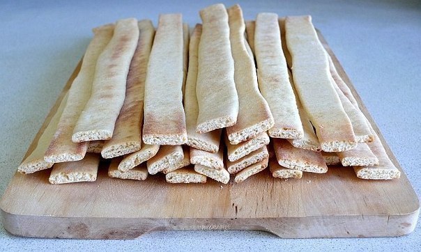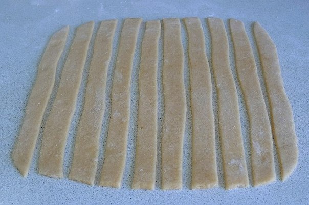 Каждую из частей раскатать на присыпанном мукой столе в прямоугольный пласт, толщиной около 0,5см (удобно раскатывать сразу на пергаменте, который потом достаточно просто перенести на противень). Пласт нарезать полосками шириной 1-1,5см и раздвинуть, чтобы они не слиплись при выпечке.