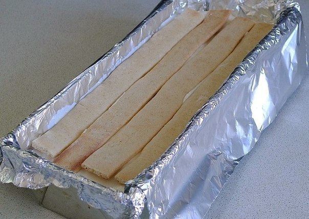 Выпекать полоски в нагретой до 220градС духовке до румяного цвета (около 5-6 минут). Вынуть и горячими подравнять под нужный размер. также поступить с остальными частями теста.