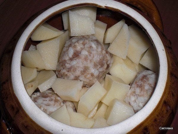 1. Картофель порезать кубиками и положить в горшок, положить фрикадельки, присолить.