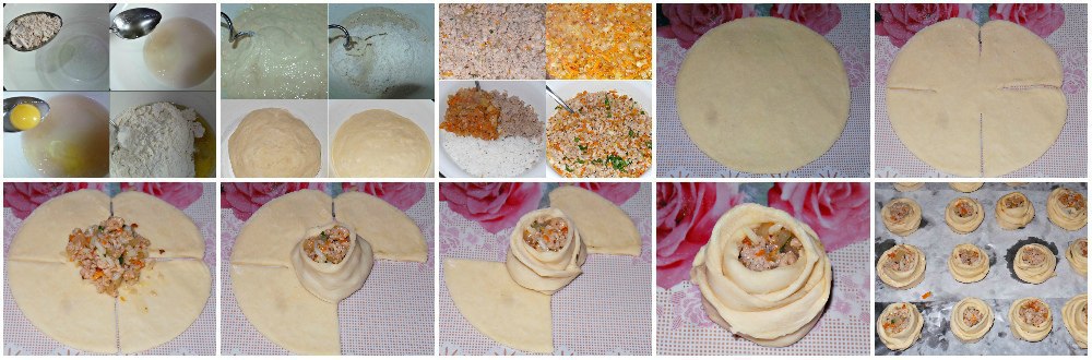 Посыпаем стол мукой и раскатываем тесто,берём что-то круглое,это может быть кружка,тарелка,и вырезаем круги ,разрезаем круг на 4 части.Посередине выкладываю ложку начинки.И по кругу собираем нашу розочку по кругу.Противень застилаем бумагой для выпечки,выкладываем наши розочки, и ставим в духовку, нагретую до 180 градусов, минут на 30—40. Приятного аппетита