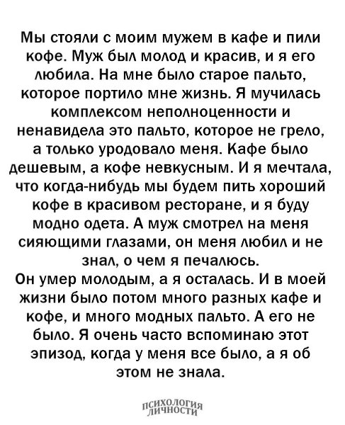 Не пью кофе)не ужинаю)не дружу) не работаю гидом-город не показываю)...МнеНужен Мужчина,СкоторымВсё вРадость:ИГоречь-неГоречь,АсладостьТакСл адость.КоторыйПоймёт,иСогреет,Ипримет,Ик СердцуПрижмёт,иНежноОбниметМнеНуженМужчи на,КоторыйПоможетИсделаетТо